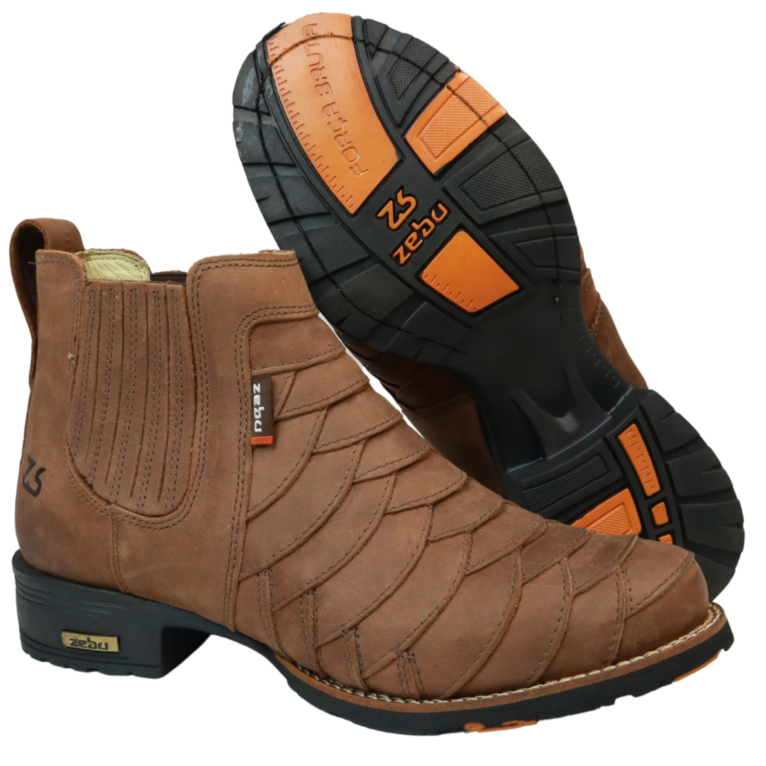 Botina Country bico redondo, toda em couro legítimo em camadas, solado antiderrapante super forte e rebosto, com palmilha confort e detalhe elastico na lateral.