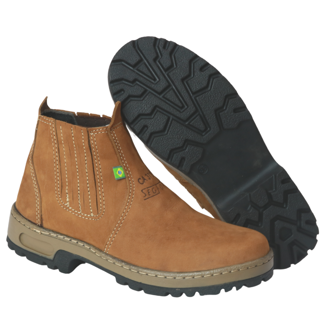 Botina de Segurança com Palmilha Confort, Solado antiderrapante colado e costurado, Couro legítimo do tipo Nobuck. Elástico lateral reforçado com couro. Bico arredondado com reforço estilo biqueira. CA 43589