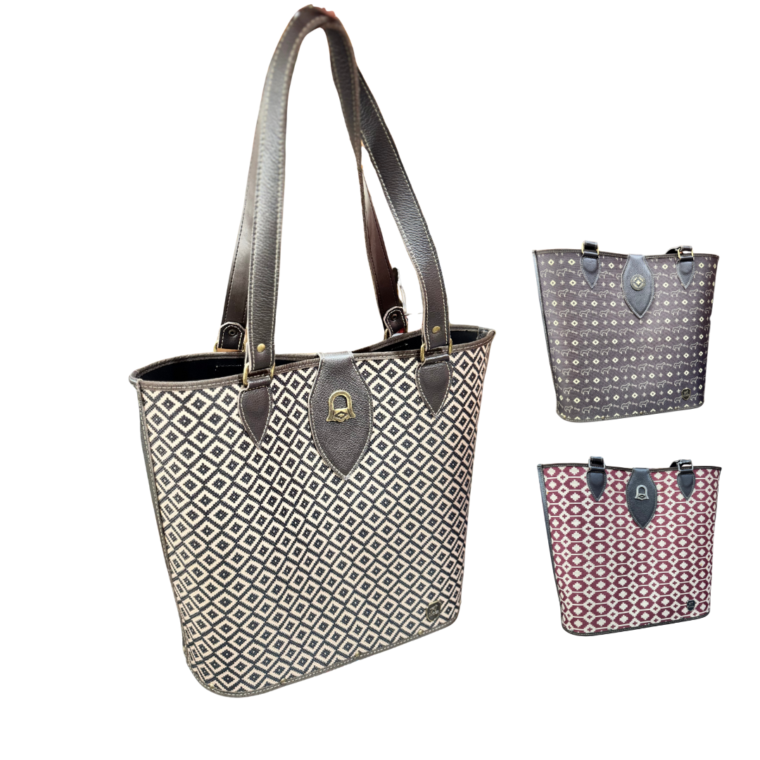 Bolsa de Mate feminina grande com alças e acabamentos em couro, viras e restante de toda a bolsa em teciso reforçado estampado.