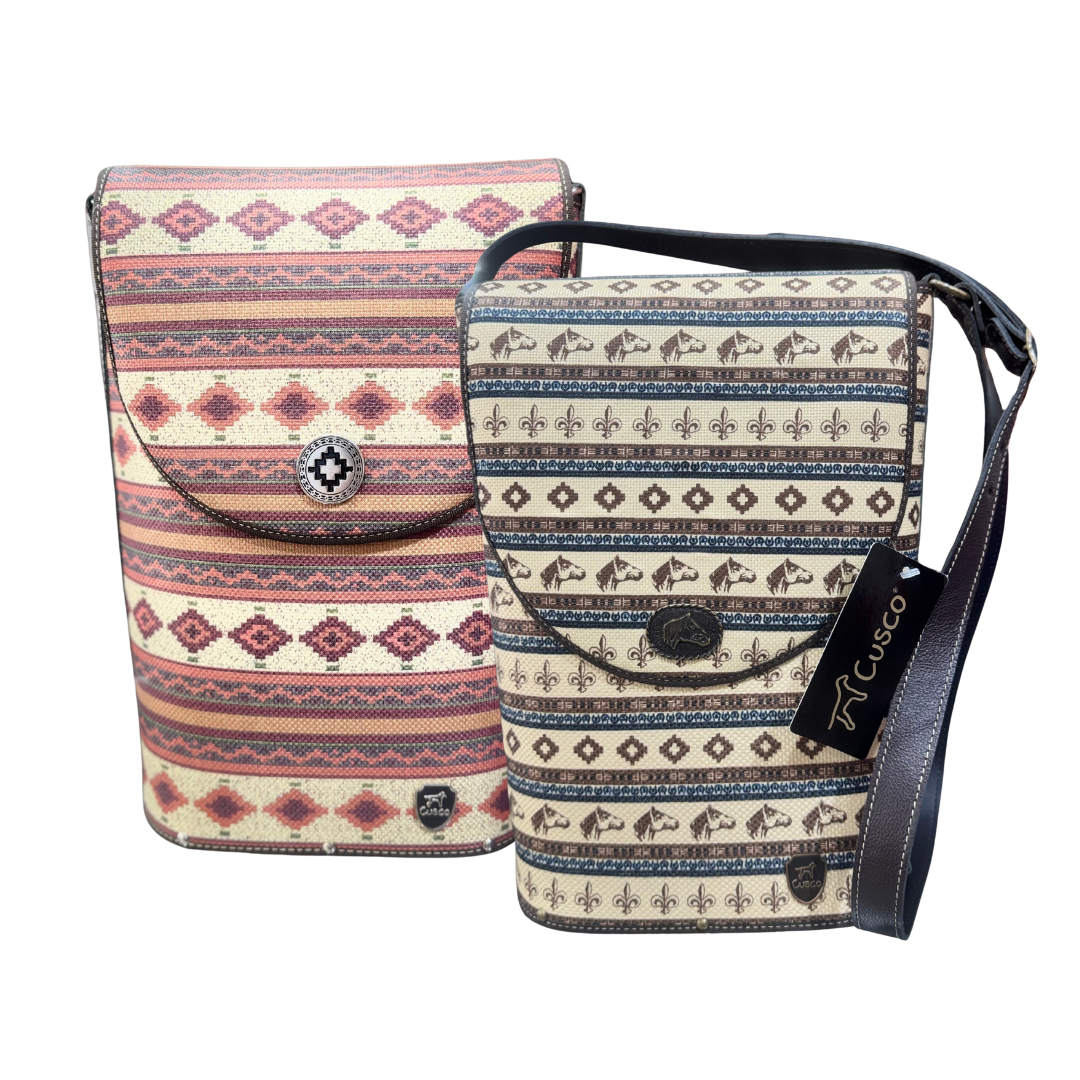 Mateira 1 litro revestida em tecido, modelo com firmeza suficiente para transportar com segurança teu chimarrão. Alça em couro legítimo com regulagem e reforço nas laterais também em couro.